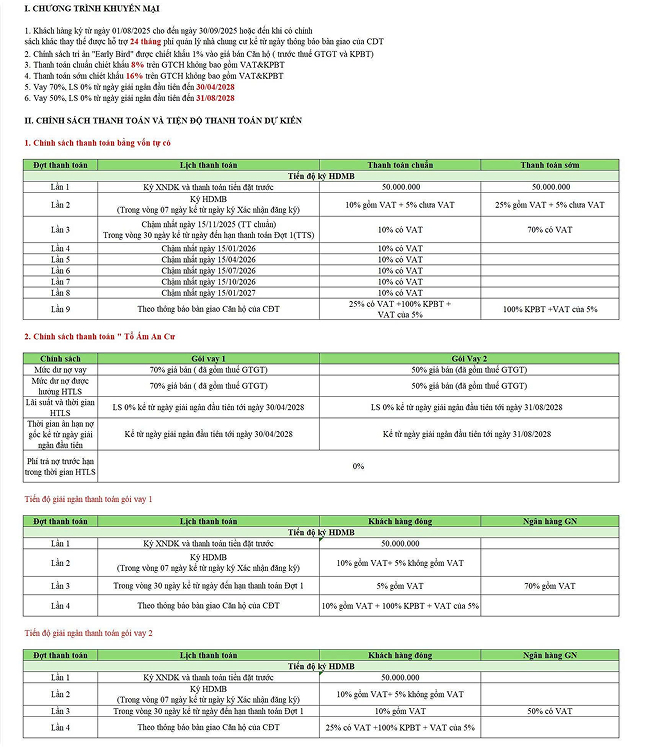Khách hàng ký từ ngày 01/08/2025 – 30/09/2025 (hoặc đến khi có chính sách khác thay thế) được hỗ trợ 24 tháng phí quản lý chung cư kể từ ngày thông báo bàn giao của CDT